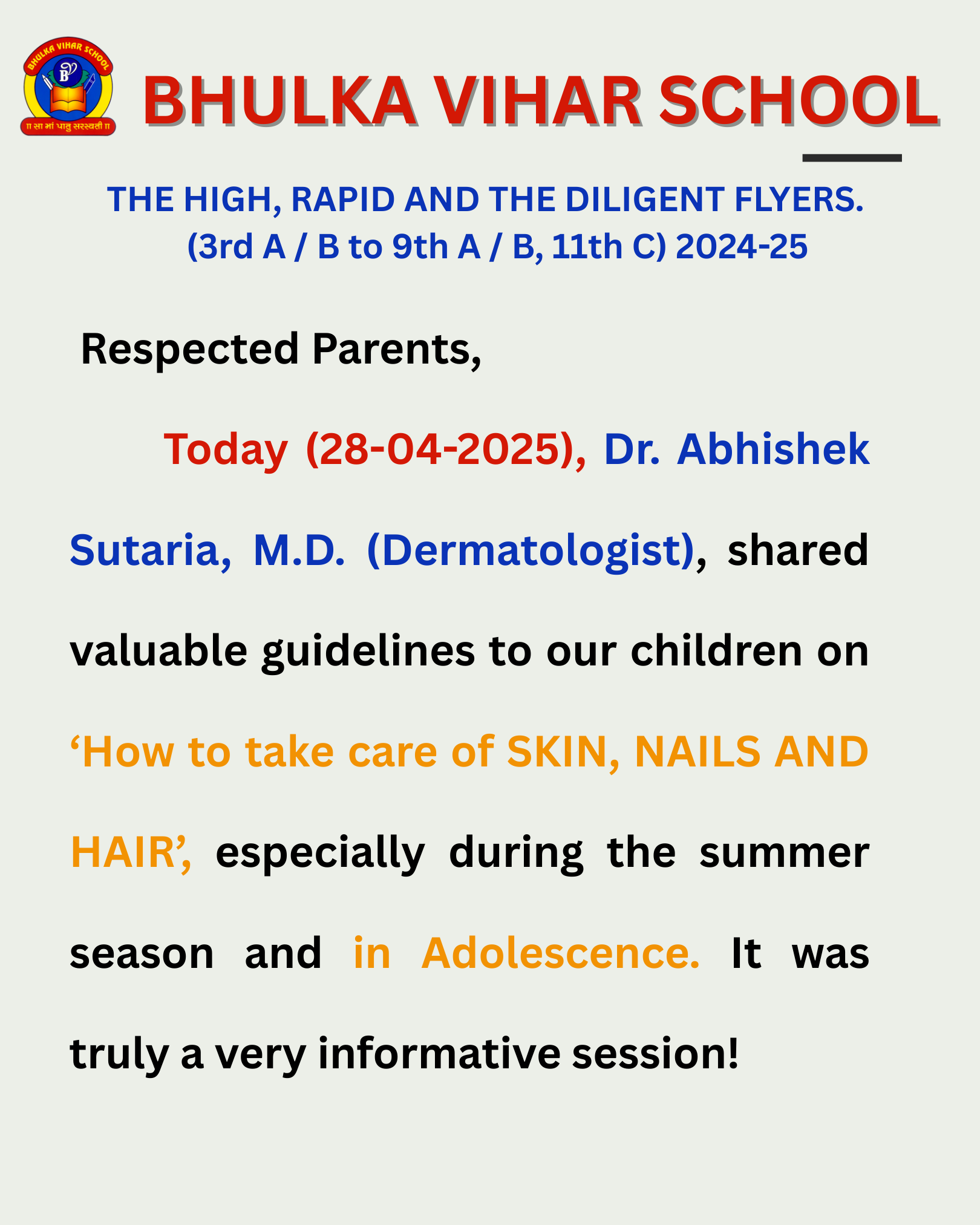 Dr. Abhishek Sutaria, M.D. (Dermatologist), shared valuable guidelines to our children…