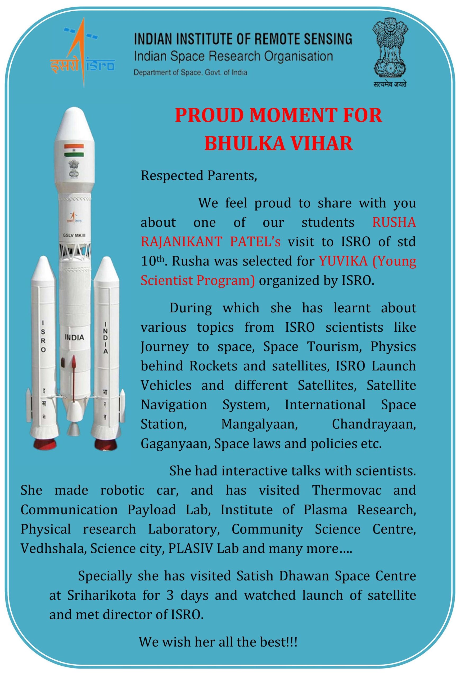 PROUD MOMENT FOR BHULKA VIHAR SCHOOL