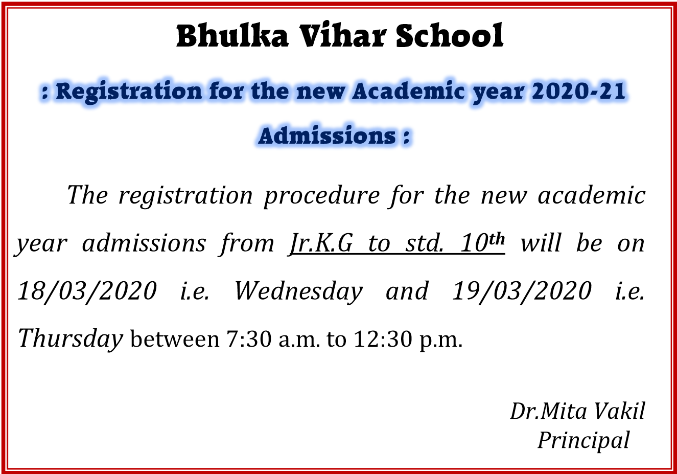 Registration for the new Academic year 2020-21